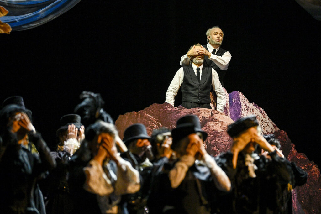 Der Regisseur Lorenzo Fiorini, *1972, kommt aus Locarno, ist ausgebildeter Cellist, und hat sich nach seiner beachtlichen Konzertkarriere bei Ruth Berghaus und Götz Friedrich als Opernregisseur ausbilden lassen. Und inszeniert preisgekrönt seither an zahlreichen deutschsprachigen Bühnen, aber auch in Kopenhagen. Er verzichtete auf Anspielungen zur Entstehungszeit der Oper, ließ zu Beginn einen Dornbusch brennen, aus dem Gott sprach, und steckte seine beiden Helden, ausgestattet wie Kinder, in ein Kasperletheater. Schon etwas verwirrend.
