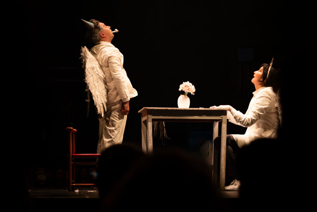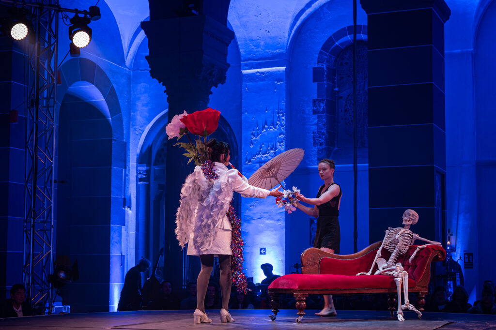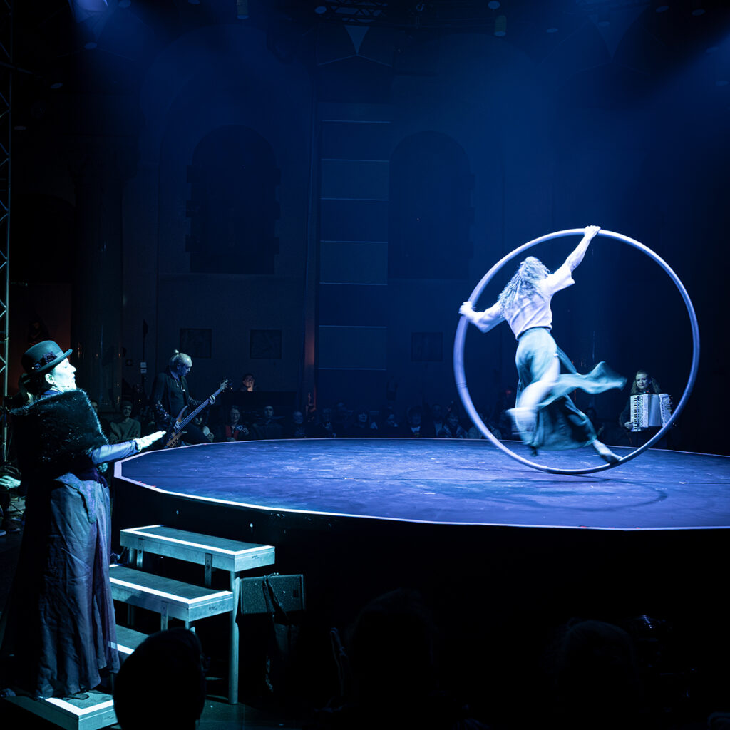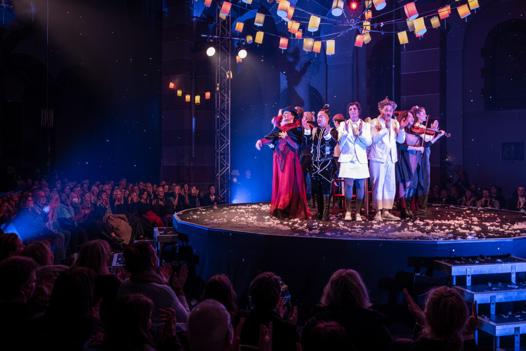 Es ist schon grandios, in dem stimmungsvollen riesigen Gotteshaus eine große Bühne mit all der Technik für die Akrobaten zu sehen, dazu unzählige Lampen und eine rote Beleuchtung, welche auch von außen ein wenig geheimnisvoll erkennbar ist. Zu erleben ist eine wunderschöne poetische Erzählung mit vielfältigen Zirkusnummern, in clowneskem Stil moderiert von zwei „Engeln“, den Ko-Regisseuren Helena Bittencourt und Goos Meeuwsen. Über die man herzlich lachen konnte, mit exzessiver Gestik und ganz ohne Sprache; sie hätten allerdings etwas weniger präsent sein dürfen.