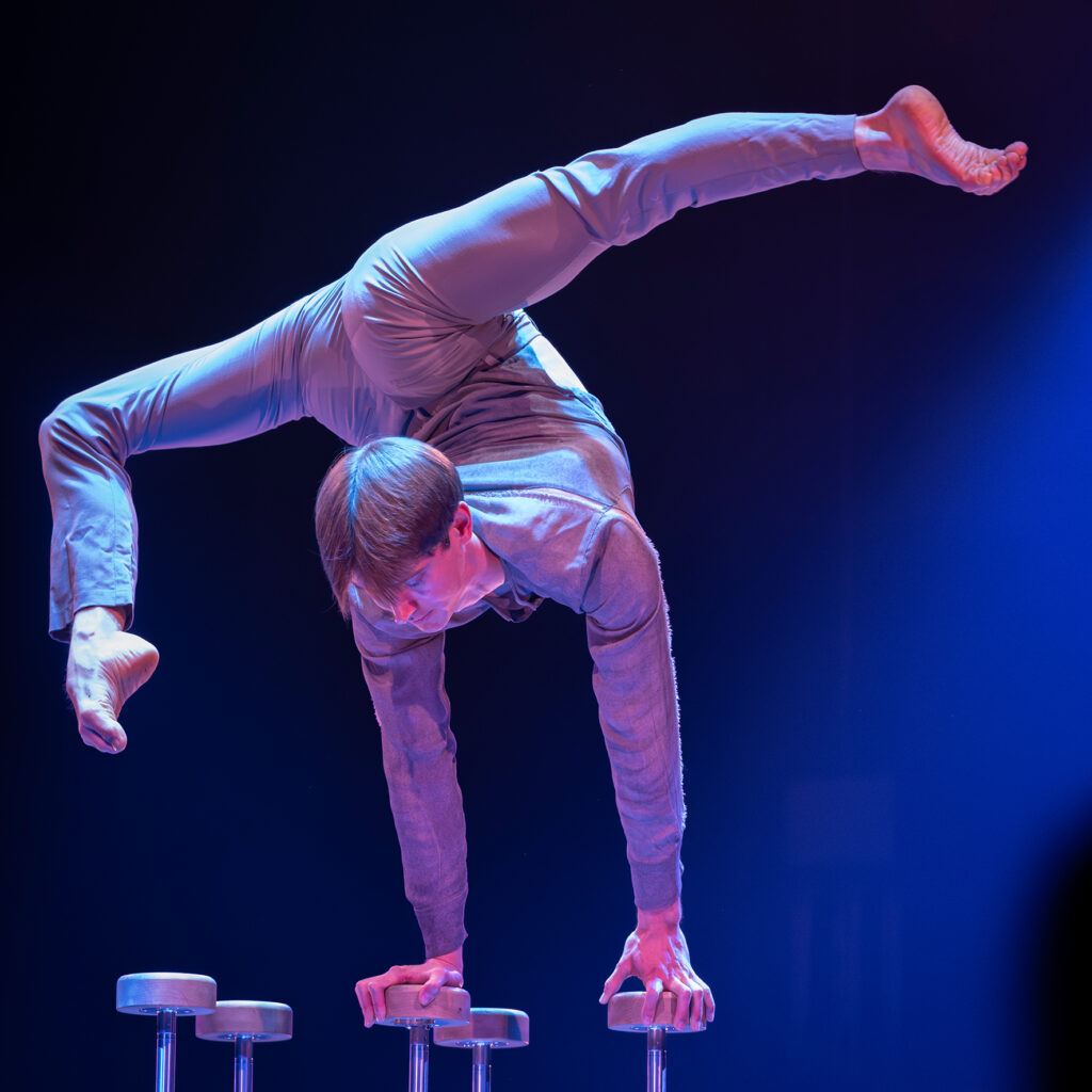 Helena Jans, wie die meisten ihrer Kollegen zum ersten Male bei Bouffon, zeigt staunenswerte kraftvolle Figuren auf niedrigen Stempeln, überleitend auf ein schwingendes Seil in der Höhe. Noch flexibler ist Louis-Thomas Gauthier, der unglaublich beinahe ein Mensch aus Gummi ist; man wundert sich, wie seine Gelenke diese extremen Verrenkungen möglich machen. Wie gut, dass es qualifizierte Orthopäden gibt.  Eine verblüffende Jonglage zeigt der Kanadier Nathan Biggs-Penton mit Objekten ganz unterschiedlicher Form und Größe, und das bekannte Cyr-Rad, ein überdimensionaler Hula-Hoop-Reifen, wird von Robin Haefeli scheinbar mühelos jeglicher Schwerkraft beraubt.