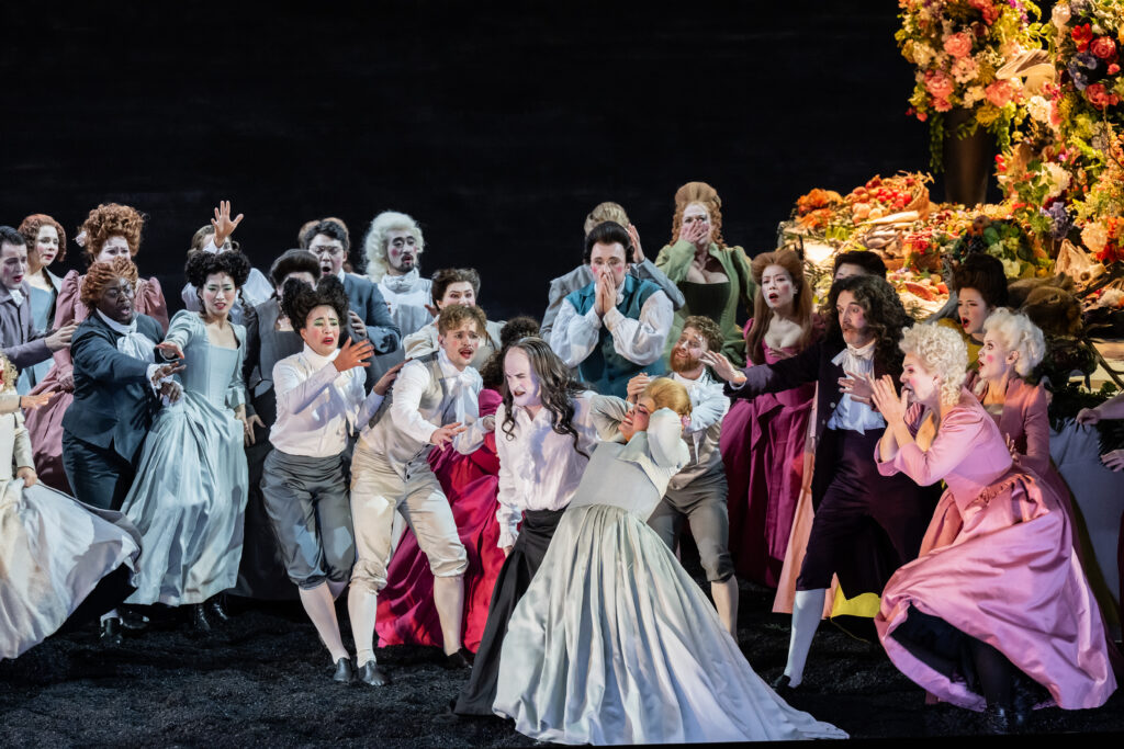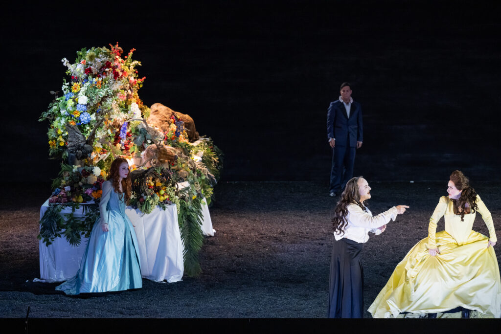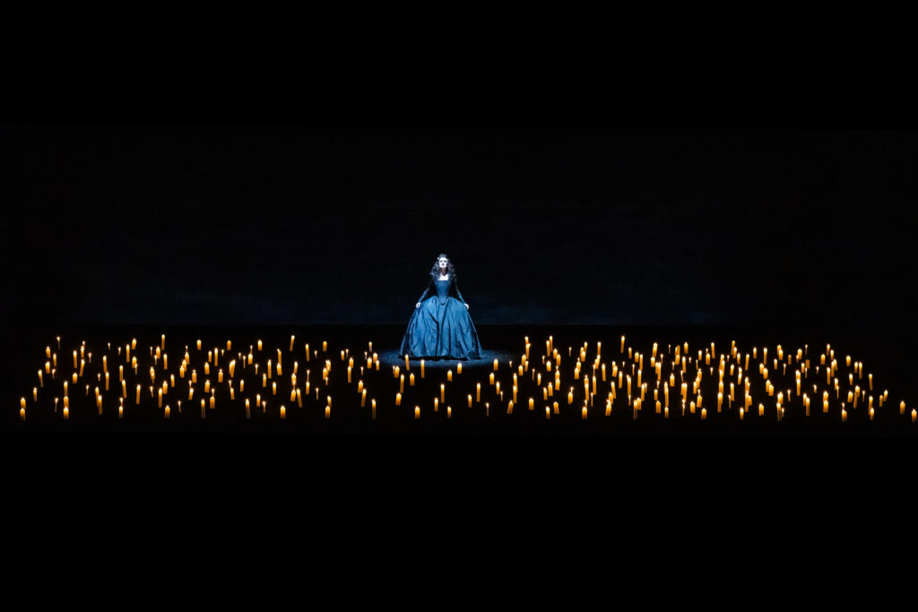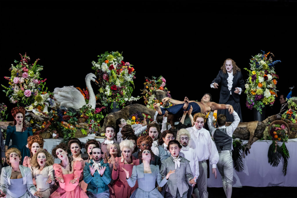 Die Feinheiten der Handlung sind wie so oft bei Barockopern nicht wesentlich. Grob geht es um König Saul, der neidisch ist auf den jungen Hirten David, welcher – wie allgemein bekannt – den Riesen Goliath mit einer Steinschleuder erledigt hatte. Am Hofe des Saul buhlt die eine seiner Töchter um den Recken, die andere lehnt ihn ab. Mit im homoerotischen Boot ist sein Sohn Jonathan. Im Krieg fallen der genervte Vater und sein Sohn, David wird König. Regie, Bühne, Licht und Choreographie für eine solche blutrünstige Geschichte sind ja nun nicht gerade einfach zu bewerkstelligen. Und hier wurde einfach ganz Großartiges getan. Angefangen mit der Bühne, wo der Vorhang nach der recht langen Ouvertüre eine riesige Tafel freigab, gedeckt mit umfangreichen Blumenarrangements und dem Chor, ein Rausch an Farben und Bewegung. Hier wartete man vergeblich auf einen spontanen Szenenapplaus. Die Bühne wurde immer dunkler und dürftiger bis zum Totenlied der Merab, wo nur noch sehr viele Kerzen die gespenstische Szene schwach beleuchteten.