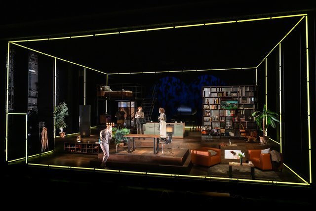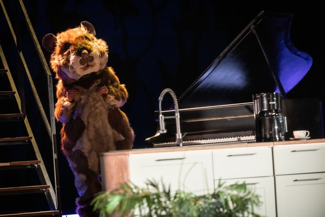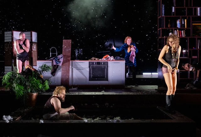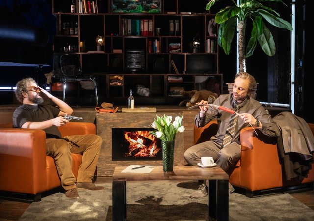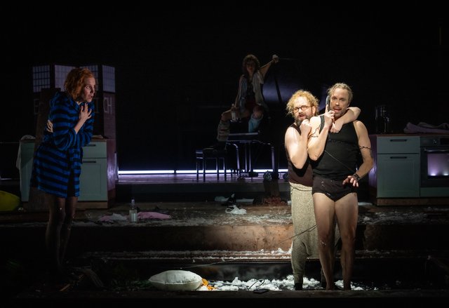 Der Hausregisseur Simon Solberg, auch für die großzügige luxuriöse Wohnung auf der Bühne verantwortlich, hatte die feine Ironie von Reza nicht übernommen, sondern arg verstärkt. Dass die schauspielerisch ausgezeichneten Protagonisten sich zunehmend an die Gurgel gehen, ist nicht mehr lustig wie in echter Slapstick-Manier, sondern eher peinlich. Wenn der Kuchen auf dem Teller durch Draufsetzen platt gedrückt wird, das geht ja noch an. Aber woher kommt der überfallartige Mückenschwarm, wer hat die Stromausfall und den nachfolgenden Einbruch verursacht, wieso kann ein Sturm die Wohnung derart verwüsten, und warum flimmern Flutkatastrophen und eine Atombomben-Explosion über den Bildschirm, wo vorher ein harmloses Kaminfeuer brannte? Das ließ die Zuschauer im vollbesetzten Theatersaal nachdenklich zurück, ebenso wie der entlaufene Hamster, der in Menschengröße mehrfach auftauchte.