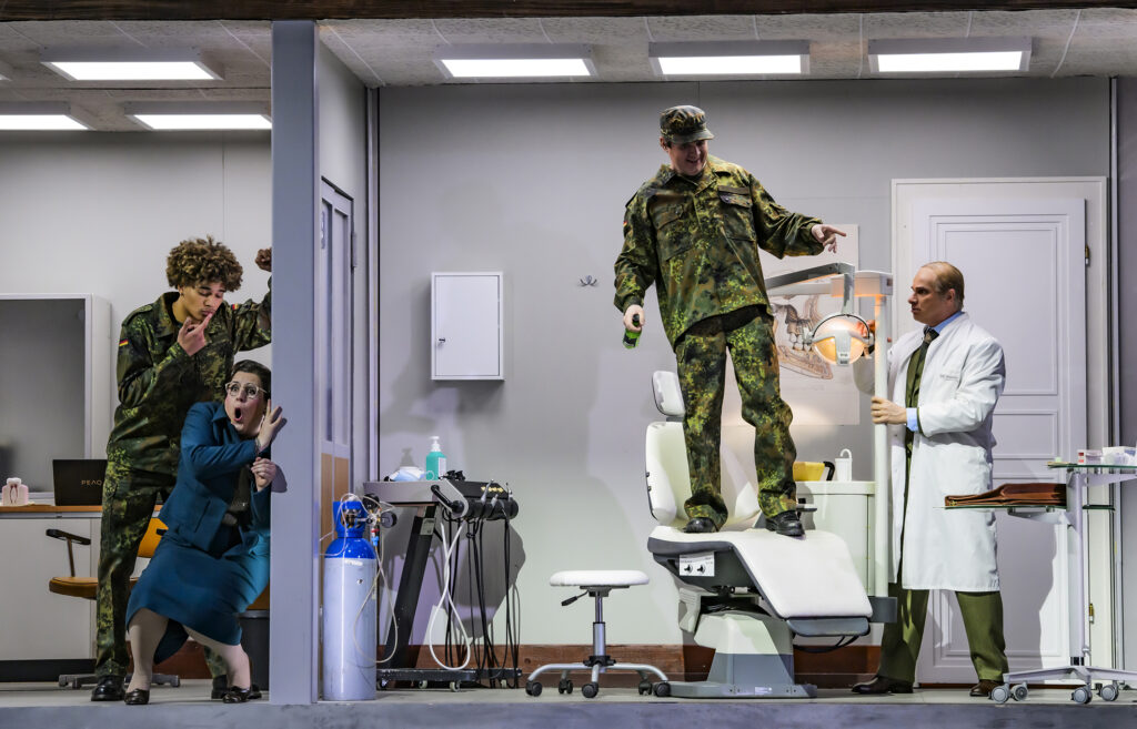 Grisha Martirosyan, ein Klasse Typ mit coolem Outfit, brilliert mit „Largo al factotum“ in der Titelpartie, mit sonorem Bariton und lockeren Koloraturen. Riesen-Applaus für diesen Ohrwurm, einfach toll! Graf Almaviva ist Anton Rositskii und erfreut mit hohen Koloraturen. Die Berta (Nicole Wacker, auch als Zahnarzthelferin engagiert) besticht mit höchsten Tönen. Und der gebieterische Doktor Bartolo (Enrico Marabelli) erfreut mit seinem prächtigen Buffo-Bass und herrlichem Spiel.