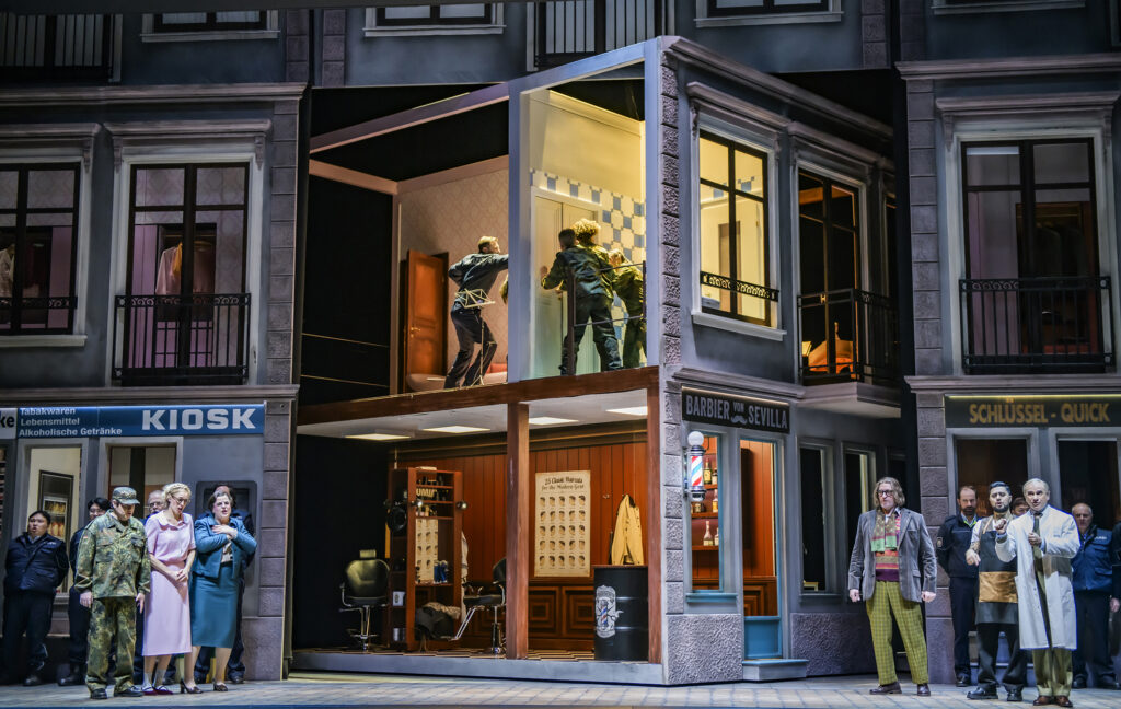 Zusammen mit dem Bühnenbildner Dirk Hofacker hat Matthew Wild die Bühne erdacht, eine Bonner Geschäftsstraße mit Schlüsseldienst, Nudel-Bar, BarberShop, diversen Reklamepostern und der Zahnarztpraxis des mürrischen Dr. Bartolo mit echtem Behandlungsstuhl. Wo er später auch tatsächlich bohrt. Der will sein Mündel, die wohlhabende Rosina, unbedingt heiraten und ist scharf auf die Mitgift. Die Bühne ist zweistöckig, oben liegt die Wohnung von Dr. Bartolo und Rosina mit einsehbarem Badezimmer und erheiternder Pinkelszene. Hofacker hat den mittleren Teil der Ladenfront trickreich als Drehbühne gestaltet. So hat der Zuschauer immer wieder wechselnde Einblicke in die Praxis, den Friseurladen, in die Privaträume. Man muss schon sehr gut aufpassen. Oben nimmt Rosina Gesangsunterricht für ihre erhoffte Karriere beim verschlagenen Don Basilio (Pavel Kudinov). In ihrem Zimmer hängt natürlichein Gemälde von Rossini.